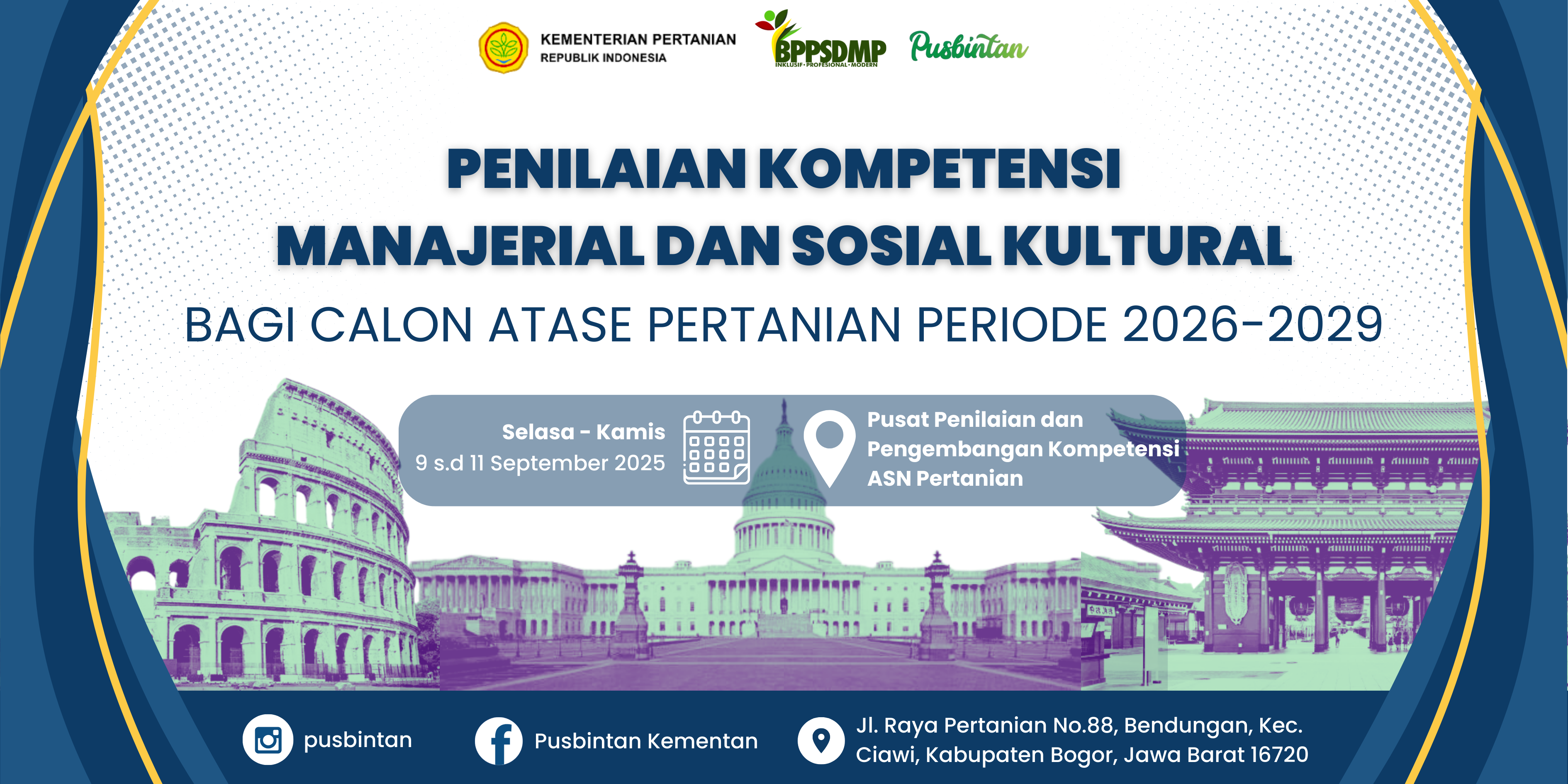 Pusat Penilaian dan Pengembangan Kompetensi ASN Pertanian melaksanakan Penilaian Kompetensi Jabatan Atase Pertanian untuk penempatan di Tokyo, Washington D.C., dan Roma periode 2026–2029. Kegiatan seleksi ini digelar secara luring (offline) di Gedung Assessment Center, Jl. Raya Pertanian No. 88, Bendungan, Kecamatan Ciawi, Kabupaten Bogor, Jawa Barat.